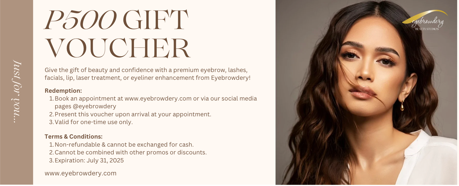Give the gift of confidence and beauty with Eyebrowdery’s exclusive e-vouchers and printed gift checks! Perfect for treating your loved ones to a premium self-care experience with services such as eyebrow enhancement, lash extensions, facials, lip blushing, eyeliner enhancement, and more.